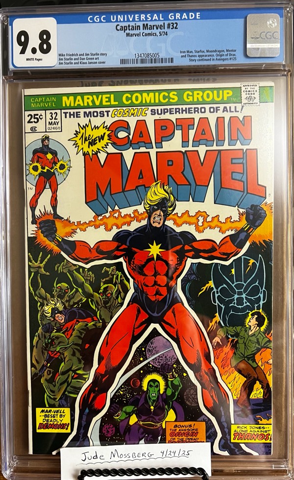 – Captain Marvel #32 9.8 CGC KEY: Origin of Drax the Destroyer & Moondragon! 1st app of Czar-Doon. Jim Starlin and Klaus Janson cover. Only 33 copies in the world! $750