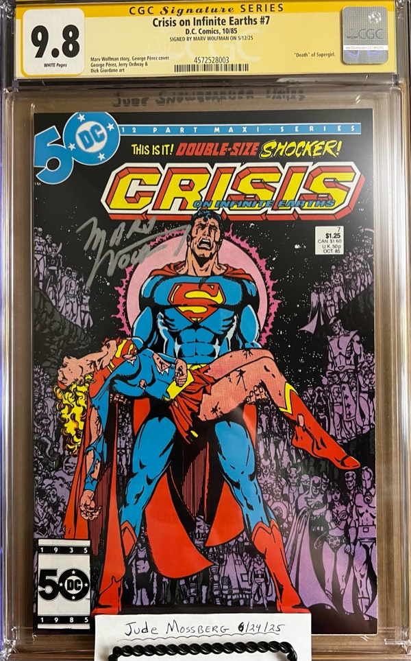 – Crisis On Infinite Earths #7 9.8 CGC SS Signed by Marv Wolfman. KEY: Death of Supergirl. Census 236. $350