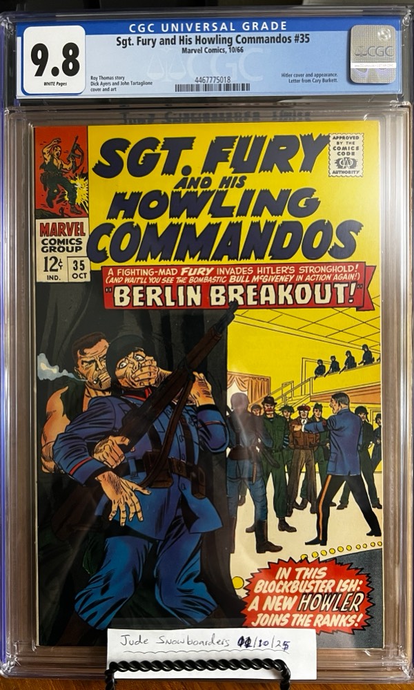 – Sgt. Fury and His Howling Commandos #35 9.8 CGC. KEY: 1st app of Corporal Ricketts Johnson, Cover art by Dick Ayers featuring Hitler!! Comment: Hitler cover and appearance., Letter from Cary Burkett. Art: Roy Thomas story, Dick Ayers and John Tartaglione, cover and art! $500 Shipped